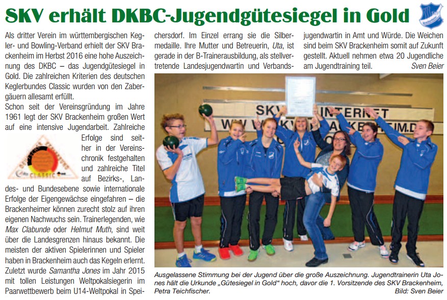 Als dritter Verein im Württembergischen Kegler- und Bowlingverband erhielt der SKV Brackenheim im Herbst 2016 die Auszeichnung des DKBC-Jugendgütesiegels in Gold. Die zahlreichen Kriterien des Deutschen Keglerbundes Classic wurden von den Zabergäuern allesamt erfüllt.