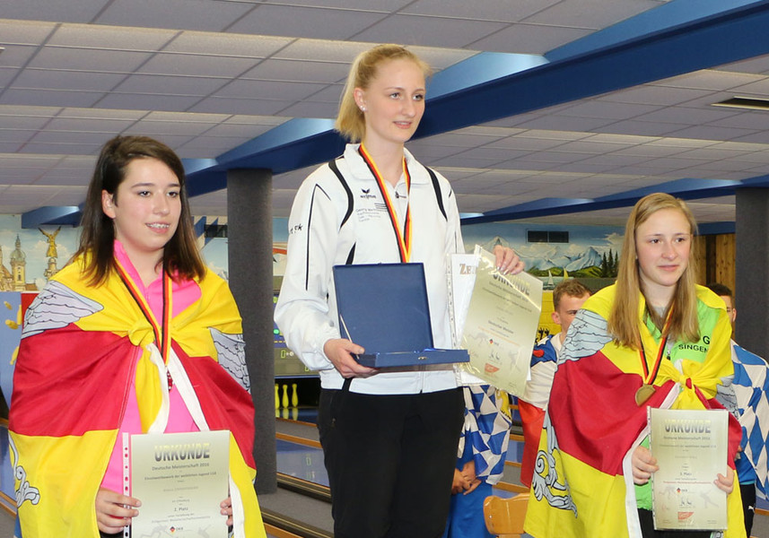 In der U18 weiblich stellte die Tandem-Weltmeisterin von 2015 und U18-Weltpokalteilnehmerin 2016, Bianca Zimmermann (KV Offenburg), das Finaltableau fast völlig auf den Kopf. Als Vorlauf-Zwölfte ging sie ins Rennen, mit Silber und 1134 Kegeln (zwischenzeitlich bereits neuer deutscher Rekord) beendete sie es nach überragenden 603 Kegeln im Finale. Ein Einzelrekord ist es nicht, den stellte ihre WM-Tandem-Kollegin Alena Bimber am Donnerstag bereits im Mannschaftswettbewerb mit 630 Kegeln auf. Eine Kontrahentin aber behielt im Endlauf die Nerven: die Vorlauf-Zweite Natalie Prchal (FV Burgsberg, im Vorjahr schon Fünfte), holte sich mit 1138 Kegeln den Titel und den deutschen Rekord mit starken 577 Kegeln im Finale. Bronze ging an Ann-Katrin Walz (Singen/1125). Vorlaufsiegerin Samantha Jones (SKV Brackenheim) fiel nach 533 im Finale auf Rang 7 zurück. Die WM-Teilnehmern 2015 in Speichersdorf Jennifer Petrik (SKV Regensburg/1106) wurde Sechste.