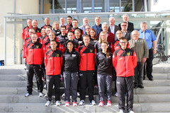 Am Rande der Sportkegel-Weltmeisterschaft lud Bürgermeister Manfred Porsch die deutsche Damen- und Herren-Nationalmannschaft zum Eintrag ins Goldene Buch der Gemeinde Speichersdorf ins Rathaus ein. Neben dem Trainergespann Günther Doleschel, Sandra Hirsch und Timo Hoffmann begleiteten DKBC-Präsident Jürgen Franke und Sportdirektor Harald Seitz die Nationalspielerinnen und Nationalspielern. Bürgermeister Porsch skizzierte die lange Zeit der Vorbereitungen und dankte im Beisein einiger Gemeinderäte den ehrenamtlichen Helferinnen und Helfern für ihr Engagement. „Wir tun alles, um Euch Sportlern die besten Bedingungen zu bieten“, hieß Porsch die deutsche Delegation herzlich in Speichersdorf willkommen. „Wir haben tolle und packende Spiele gesehen. Die Stimmung ist super“, bedankte sich das Gemeindeoberhaupt für die bisher gezeigten Leistungen. Er sei während der Wettkämpfe zu einem wahren Kegel-Fan geworden und bewundere die Präzision, Ausdauer und die Kraft der Athleten.