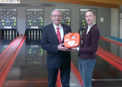 Vor Beginn der Classic-Konferenz des DKBC in Öhringen überreichte am Samstagmorgen die Geschäftsführerin Jutta Haupt Szyza von der Berliner Firma ResQ-Care das erste lebensrettende Service-Paket an den DKBC-Präsidenten Jürgen Franke zum Start der Initiative "die herzsichere Kegelbahn".