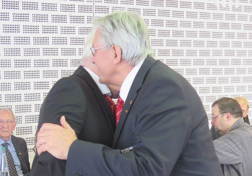 Emotionaler Stabwechsel.:Der neue DKBC-Präsident Franz Schumacher umarmt den bisherigen DKBC-Präsidenten Jürgen Franke.