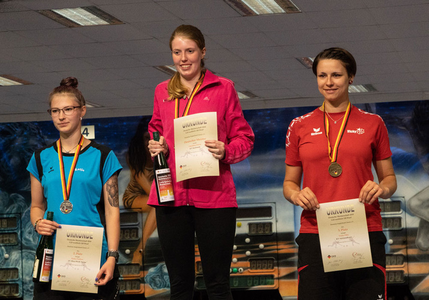 Die Team-Weltmeisterin von 2017, Alina Dollheimer, beherrschte die Frauenkonkurrenz und war nach drei Durchgängen bereits uneinholbar enteilt. Gemeinsam mit Corinna Kastner feierten die Bambergerinnen einen Doppelerfolg, Yvonne Schneider verpasste Silber durch die geringeren Gesamtkegel.