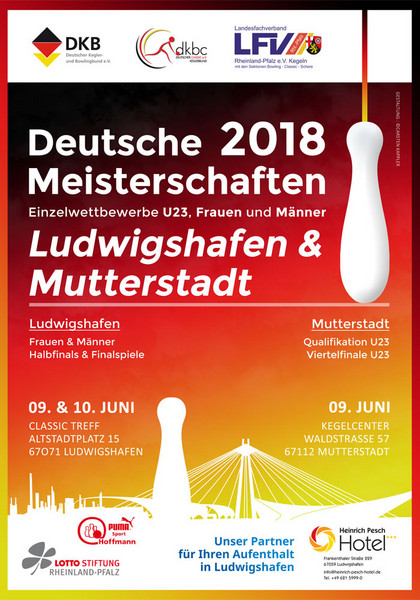 Mit allen Titelverteidigern, zahlreichen WM-Akteuren und zwei Wettkampforten versprechen die Deutschen Einzel-Meisterschaften am 9. und 10. Juni 2018 ein Highlight am Ende einer langen Saison. So starten am Samstag in der Qualifikation unter anderem die Vorjahressieger Silke Riedel (Frauen, KKV Saalekreis, 11:10 Uhr)), Daniel Schmid (Männer, KV Singen, 14:40 Uhr) in Ludwigshafen-Oggersheim sowie Celine Zenker (U23 weiblich, KSV GRäfinau-Angstedt 11:15 Uhr) und Dejan Lotina (U23 männlich, SF Friedrichshafen, 15:45 Uhr) in Mutterstadt. Aus dem erfolgreichen WM-Team von Cluj ragen Einzelweltmeisterin Sina Beißer (11:10 Uhr) sowie die Vizeweltmeister Manuel Weiß (13:35 Uhr) und Axel Schondelmaier (14:40 Uhr) heraus, Kombinations-Vize Timo Hoffmann hingegen ist nicht am Start. Auch die U23-Titelverteidigerin Celine Zenker hatte mit der U23 weiblich in Cluj Silber gewonnen. Neben ihr sind auch alle anderen WM-Teilnehmer der U23 inklusive des Bronze-Tuos Johannes Arnold/Florian Wagner am Samstag in Mutterstadt am Start. Im Anschluss an die Qualifikation findet im Classic-Treff bzw. Kegelcenter das Achtelfinale statt. Die Halbfinals und Finals werden alle in Luwigshafen am Sonntag ausgetragen.