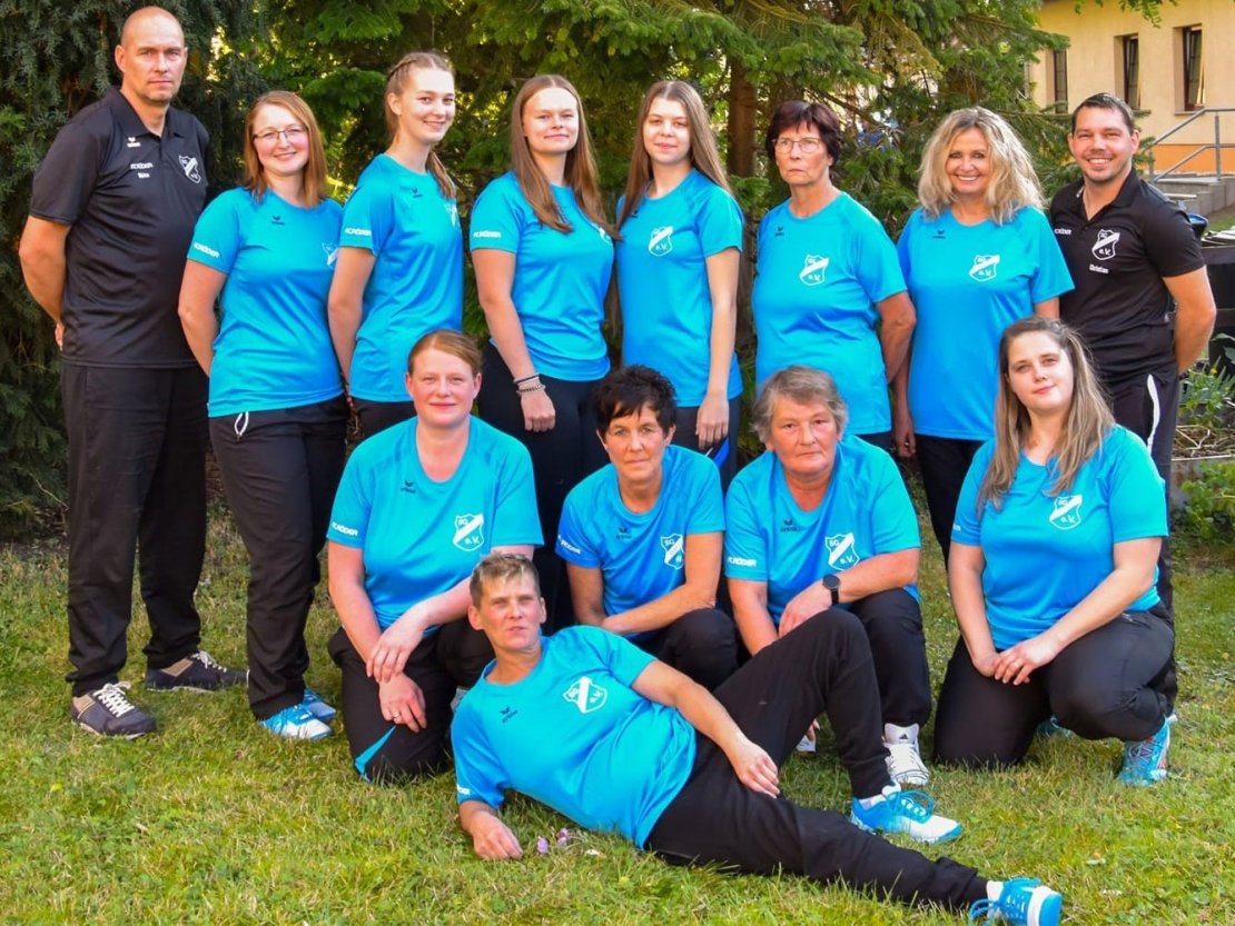 Stehend von links: Mirko Beyer(Trainer), Sandra Böttcher, Hannah Berger, Alina Beyer, Leonie Müller, Evelin Stephan, Petra Müller, Christian Schreiber(Trainer); kniend von links: Anja Sturm, Ilka Milkowski, Irena Schock, Sarah Schmeißer; liegend: Silke Reisdorf. Foto: SGW