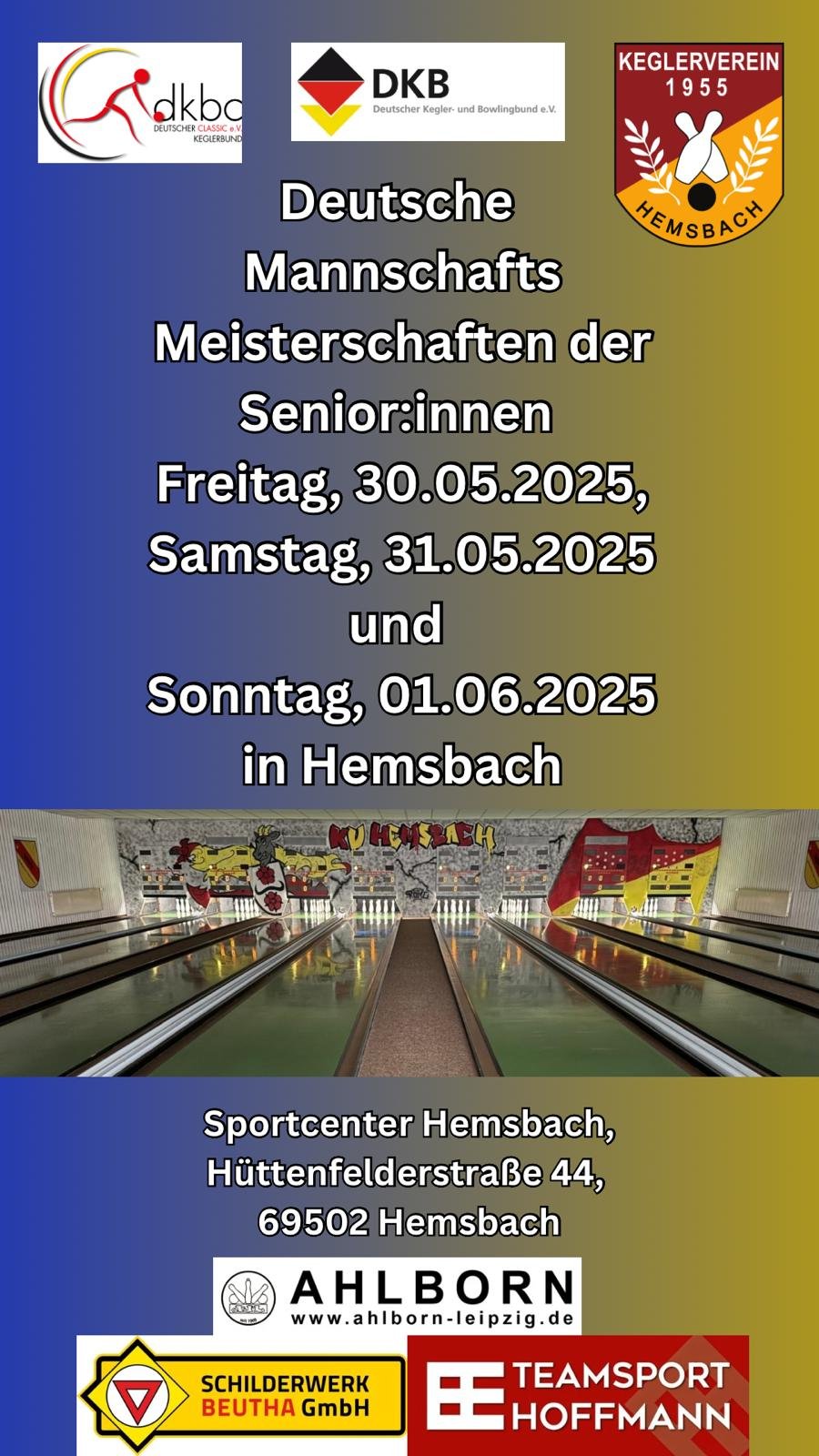 Am Wochenende nach dem Vatertag treffen sich die Seniorenkegler:innen des Deutschen Keglerbundes Classic (DKBC) in Hemsbach (Nordbaden), um die Deutschen Meister der jeweiligen Altersklassen auszuspielen. Der gastgebende Keglerverein Hemsbach wurde unter anderem damit beauftragt, diese Titelkämpfe durchzuführen, da der Verein 1955 gegründet wurde und in diesem Jahr sein 70-jähriges Bestehen feiern kann.