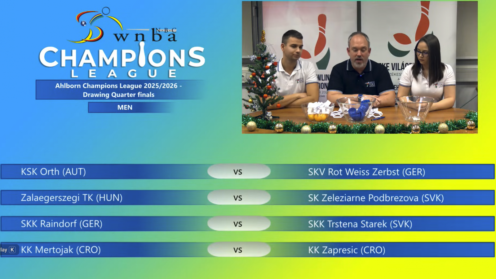 Mit dem Weltpokaldritten KSK Orth zog der Weltpokalzweite Zerbst bei den Männern ein schweres Los im Viertelfinale der Champions League und wird versuchen, sich im Hinspiel in Österreich eine gute Ausgangsposition zu verschaffen, um das Final Four in Brcko (BIH) zu erreichen. Ein vermeintlich leichteres Los zog der Titelverteidiger Raindorf mit dem Europacup-Vierten SKK Trstena Starek aus der Slowakei und kann im ersten Spiel auf das Heimrecht bauen.