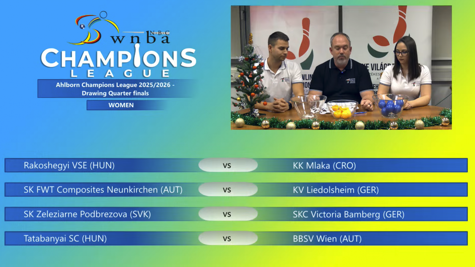 Bei den Frauen beginnen beide deutschen Teams auswärts. Weltpokalsieger Liedolsheim reist in einer Neuauflage des Weltpokalfinales zum SK Neunkirchen, der in der 1. Runde Pöllwitz aus dem Wettbewerb geworfen hatte. NBC-Pokalsieger Bamberg zieht es in die Slowakei zum Weltpokalfünften SK Zeleziarne Podbrezova.
