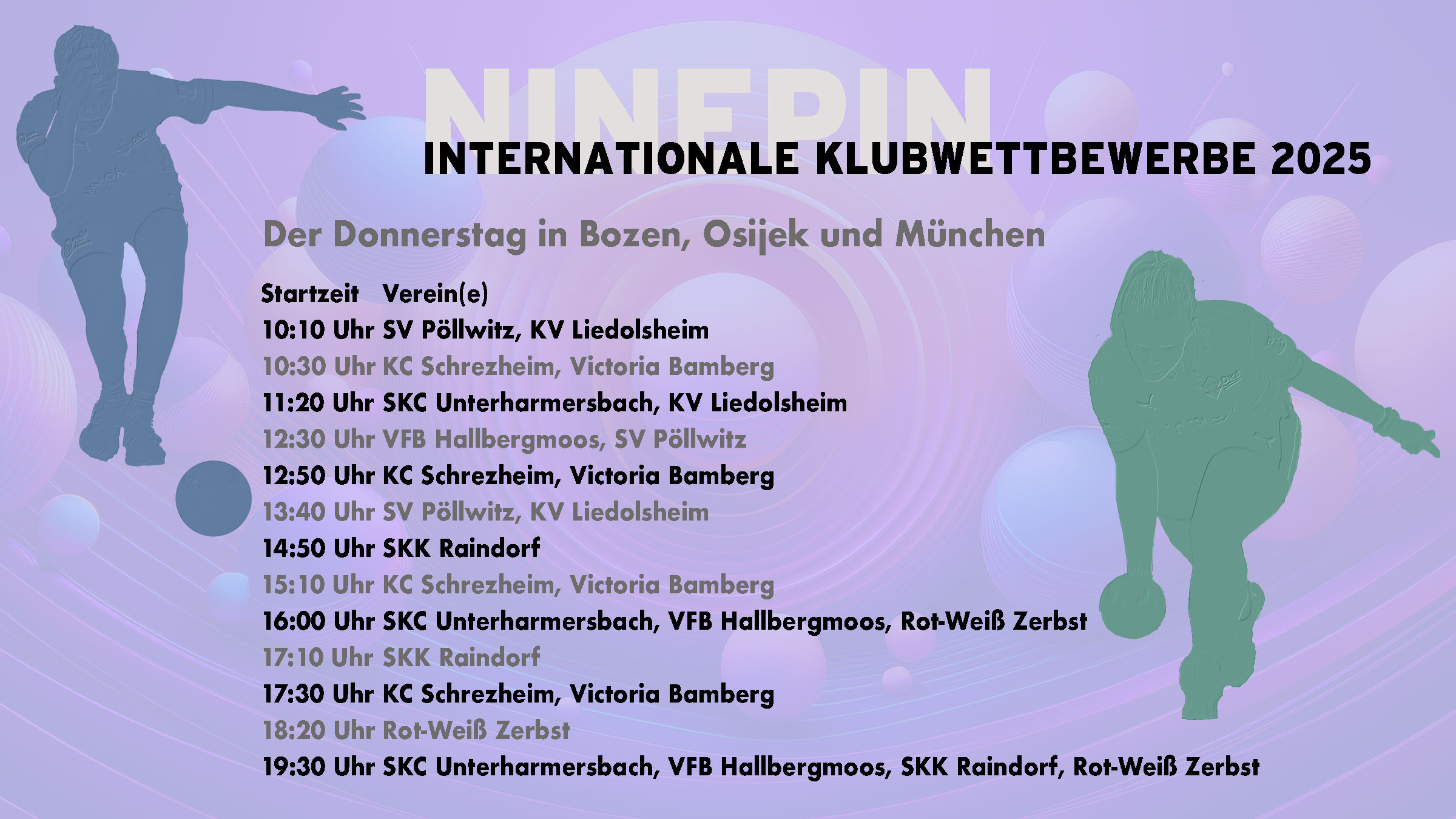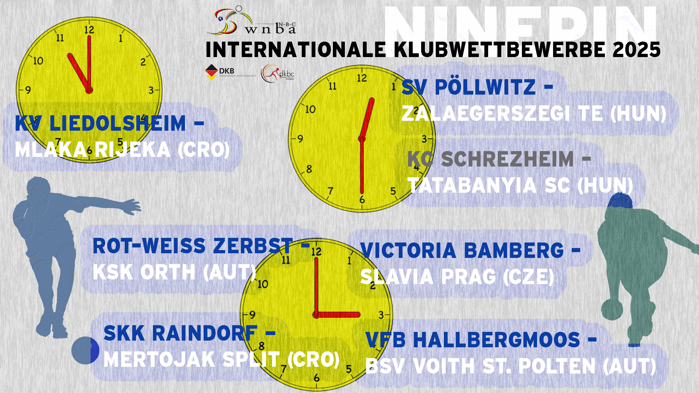 Bei den sechs Entscheidungen in den Klubwettbewerben der NBC am Samstag stand in jedem Finale eine deutsche Mannschaft. Die Frauen gewannen alle drei Wettbewerbe: Der KV Liedolsheim sicherte sich den Weltpokal, der SV Pöllwitz den Europapokal und Victoria Bamberg den NBC-Pokal. Bei den Männern gewann der SKK Chambtalkegler Raindorf den Europapokal, der VFB Hallbergmoos den NBC-Pokal, Rot-Weiß Zerbst holte Silber beim Weltpokal. Zum Auftakt hatte der KC Schrezheim im NBC-Pokal Platz 3 belegt und sich damit den siebenten Platz einer deutschen Mannschaft in der Champions League gesichert.