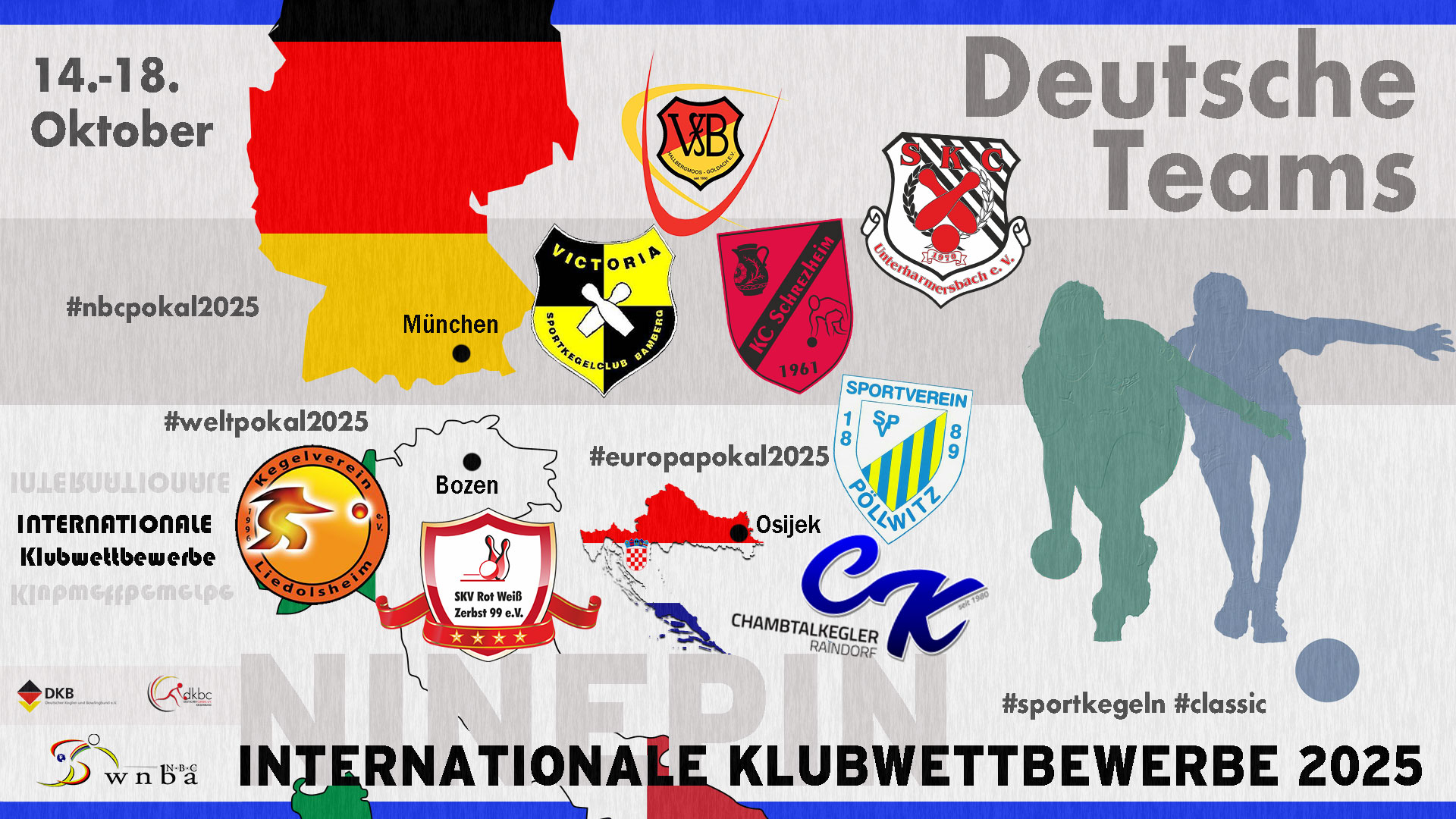 Vom 14. Oktober (Europapokal) bis 18. Oktober 2025 finden die Internationalen Klubwettbewerbe der NBC statt. Der Weltpokal wird in Bozen (ITA) ausgetragen, der Europapokal findet in Osijek (CRO) statt und der NBC-Pokal wurde an München vergeben. Für Deutschland gehen acht Teams an den Start, darunter die Titelverteidiger Rot-Weiß Zerbst (Weltpokal Männer) und der KC Schrezheim (NBC-Pokal Frauen). Weitere Starter sind der Europapokalsieger KV Liedolsheim, der diesmal im Weltpokal an den Start geht, der Champions-League-Sieger SKK Raindorf, der wie auch der vorjährigen NBC-Pokalfinalist bei den Frauen, SV Pöllwitz, im Europapokal startet. Im NBC-Pokal spielen Victoria Bamberg bei den Frauen sowie der SKC Unterharmersbach und der VFB Hallbergmoos bei den Männern. Das Final Four mit Halbfinals und Finalspielen wird am 17. und 18. Oktober ausgetragen.